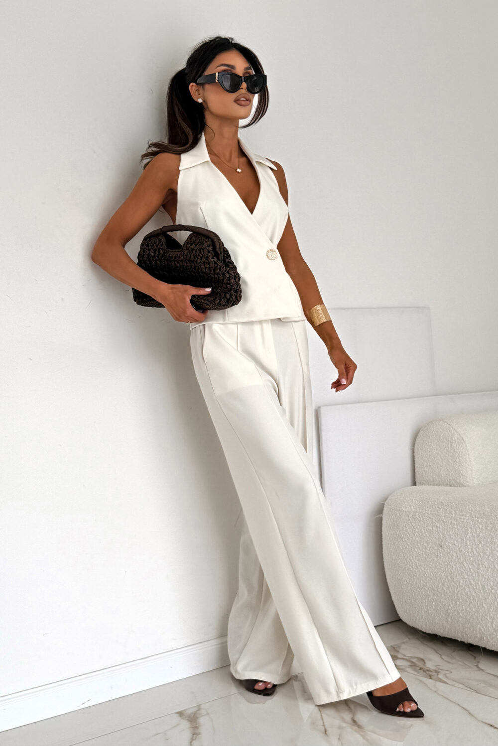 Stylowy komplet o nowoczesnym kroju, składający się z dopasowanej kamizelki zapinanej na ozdobny guzik oraz spodni o eleganckiej, szerokiej nogawce. Model łączy minimalistyczny design z wyrafinowanymi detalami, zapewniając komfort i swobodę noszenia. Dostępny w kolorach: różowym, białym, beżowym oraz czarnym. Wykonany z wysokiej jakości mieszanki: 60% poliamid, 30% wiskoza, 10% elastan – gwarantującej trwałość, oddychalność i elastyczne dopasowanie.